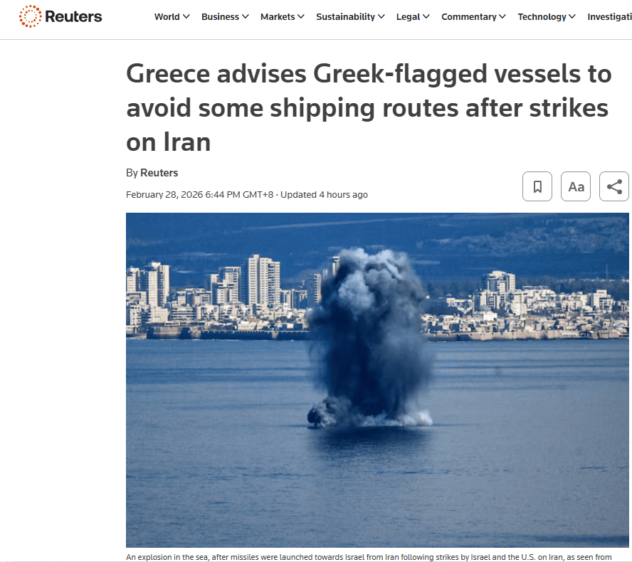 政府层面的风险提示正在升级。路透社披露,希腊航运部在2月28日发布通告,建议希腊籍船舶在当前形势下保持最高警惕,并避免进入波斯湾、阿曼湾及霍尔木兹海峡等海域;同时要求管理公司在相关海域及以色列港口执行最高等级安保措施,直至另行通知。