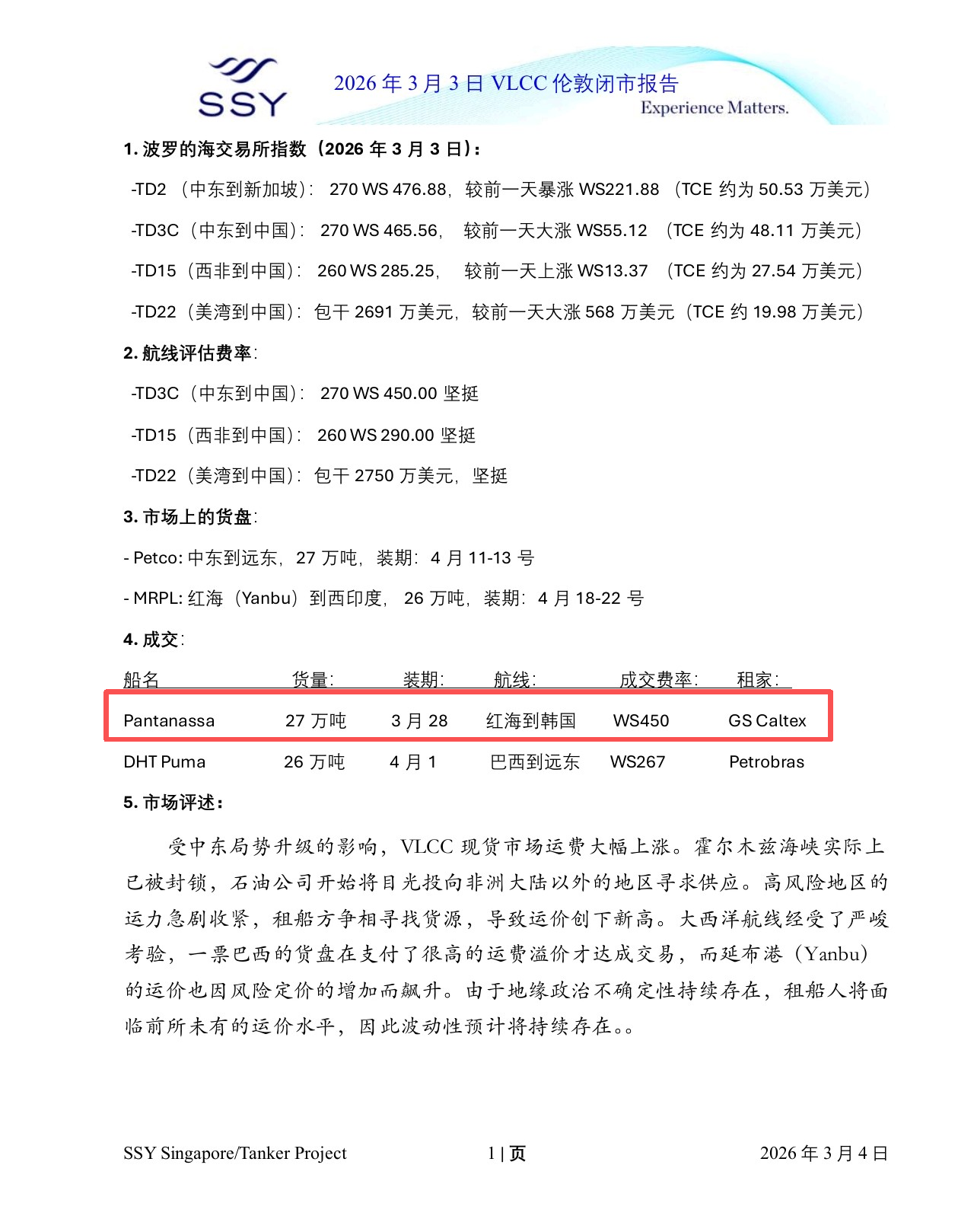 稍晚时候,SSY向信德海事证实了这一天价成交单。其数据显示,Pantanassa 载货量为27万吨,预计3月28日开始装货,成交费率为WS450。