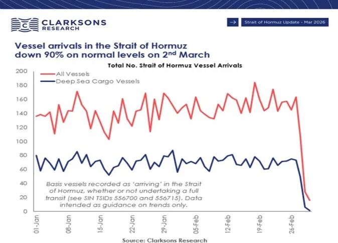 据Clarksons(克拉克森)情报数据显示,冲突爆发后短短数日内,霍尔木兹海峡的交通量暴跌了94%。至少有200艘从事国际合法贸易的油轮(其中包括60艘VLCC,约占全球合规VLCC总运力的8%)被迫抛锚滞留在波斯湾内部的终端或在阿曼湾外徘徊。