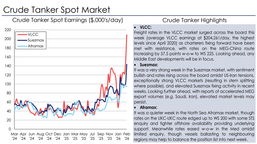 回到整体油轮运价的视角来看,伊朗于美以之间的战争及其对霍尔木兹海峡的封锁直接导致了中东油轮可用运力的断崖式收缩。