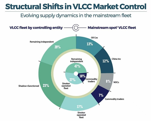 具体来说,多家海事数据机构(Signal Ocean, Veson)深度报告揭示,Sinokor通过耗资超25亿美元的布局,其在合规VLCC现货市场的份额瞬间飙升至极度危险的24%,实际控制的现货船舶数量直逼150艘。