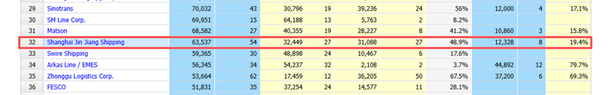 随着新船订单的不断落地,锦江航运在全球集运市场的地位也得到了进一步巩固。根据最新的 Alphaliner运力百强榜单数据,锦江航运目前在全球集装箱班轮公司中排名第32位。
