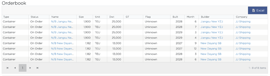在手订单:8艘、12,328TEU,占现有总运力的19.4%