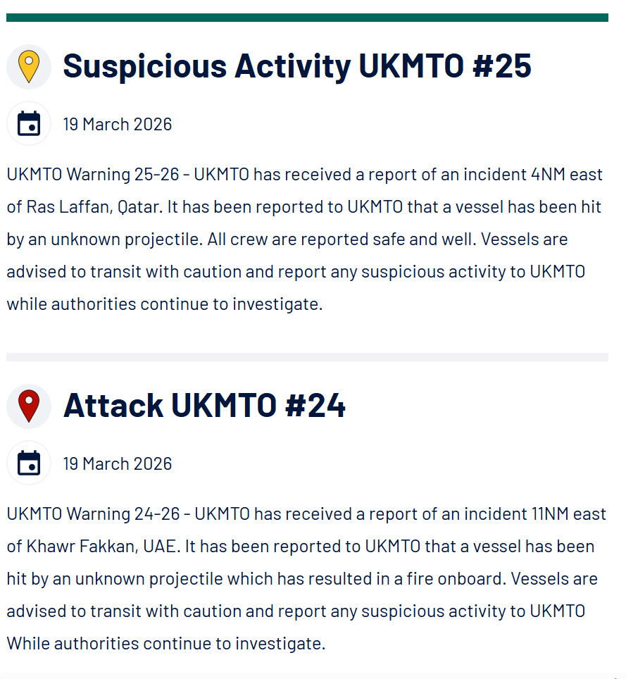 更值得警惕的是,袭击区域已经从霍尔木兹海峡及其邻近水域,进一步扩展到阿联酋东岸外海,Khor Fakkan、富查伊拉、杰贝阿里周边航道的安全压力持续上升。