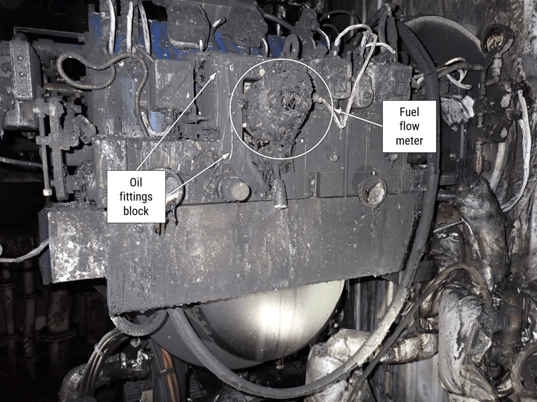 事发时该位置燃油压力为 3 巴,被挤压的密封圈长期受高压燃油作用,密封性能持续劣化,最终发生破裂,导致加压燃油从破损处喷出并雾化。