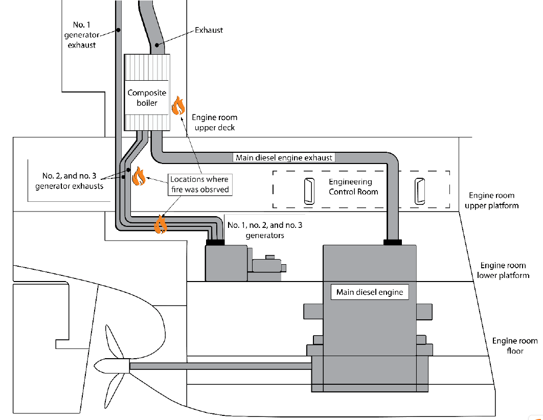 当日上午,轮机长穿戴自给式呼吸器进入机舱,经气体检测仪检测确认舱内环境安全后,启动 1 号发电机(其排气未接入锅炉系统),初步判定火灾起火点位于锅炉燃烧器的燃油流量计附近。