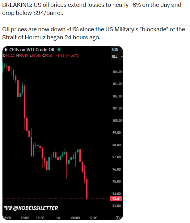 布伦特原油期货价格单日大幅下跌4.57美元(降幅4.6%),收于每桶94.79美元;随后微调至95.08美元至95.10美元区间;美国西德克萨斯中质原油(WTI)更是暴跌7.80美元(降幅7.87%),收于每桶91.20美元(后微调至91.29美元左右)。这一暴跌是油价在经历六周的攀升后,首次真正跌破100美元。