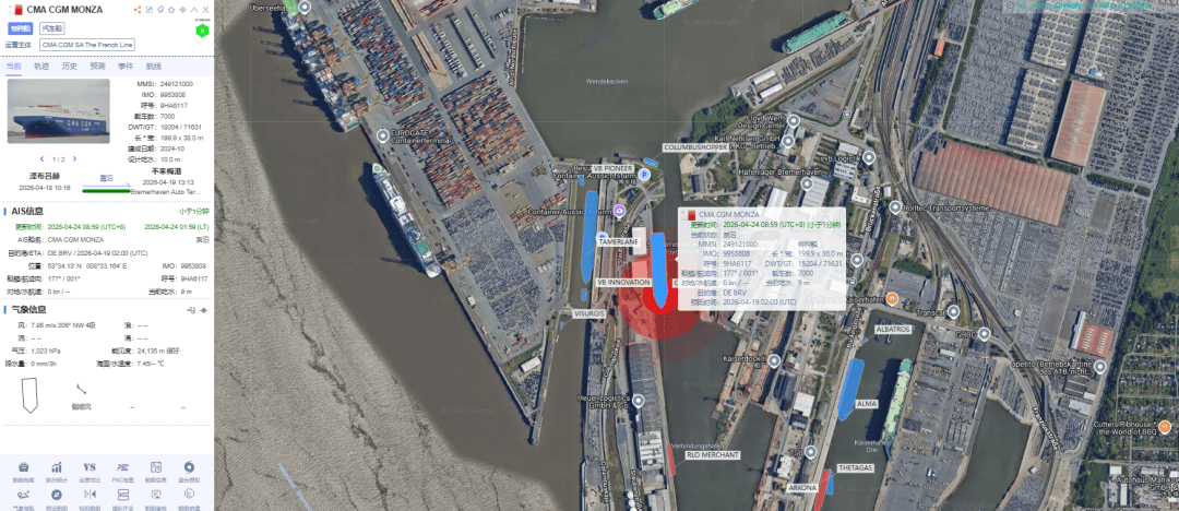 事故发生时,该船正驶入不来梅港港区,受突发强风阵风影响,船舶操纵难度大幅增加,船员见状立即请求港口增派一艘港作拖轮协助操控。尽管额外拖轮及时到位提供辅助,但持续的强风仍未能得到有效控制,最终推动“CMA CGM Monza”号撞上了港区内一座原为旋转桥的码头,引发船体损伤。