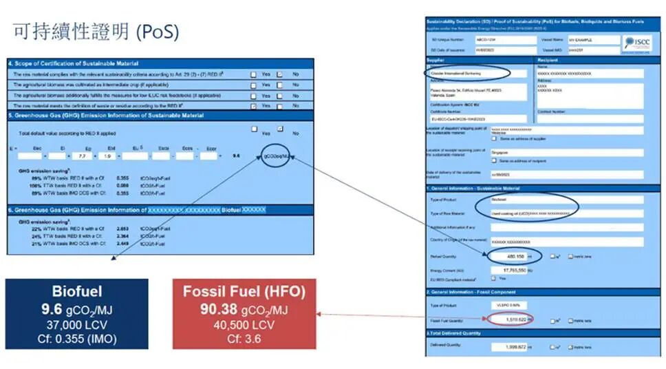 已通过国际认证计划认证的生物燃油,与石油 MGO 的全生命周期温室气体排放强度值 94 gCO2eq/MJ 相比,其全生命周期温室气体排放量至少减少 65%,即生物燃油的温室气体排放强度值应不超过 33gCO2eq/MJ,这个数值可以在加油商提供的ISCC PoS证书上获得;