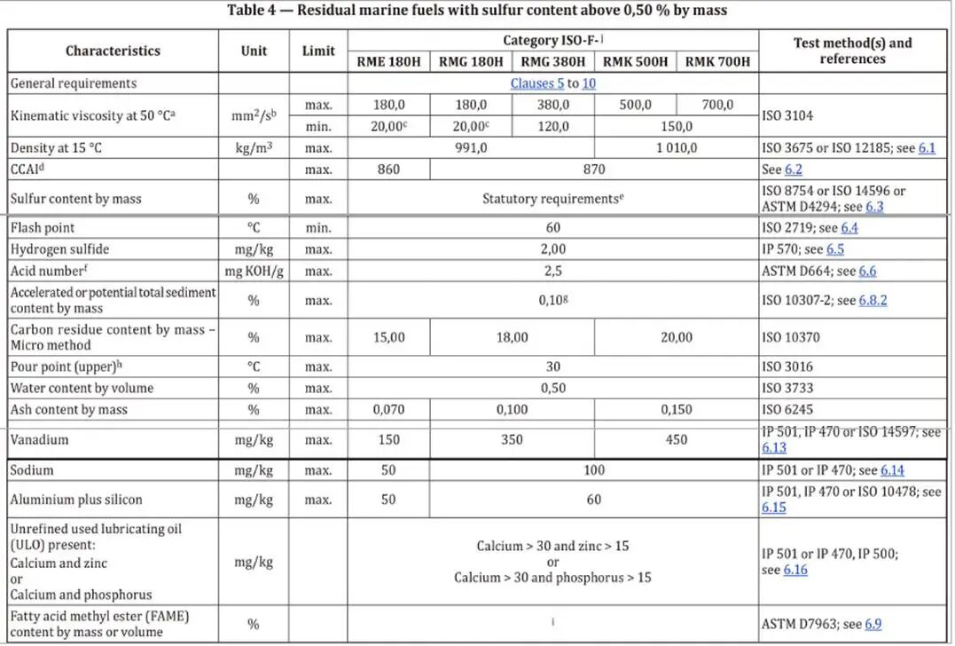 表4:硫含量超过0.50%的残渣船用燃料(高硫油HSFO,通常用于配备排气清洗系统(如脱硫塔EGCS)的船舶;