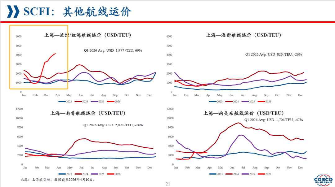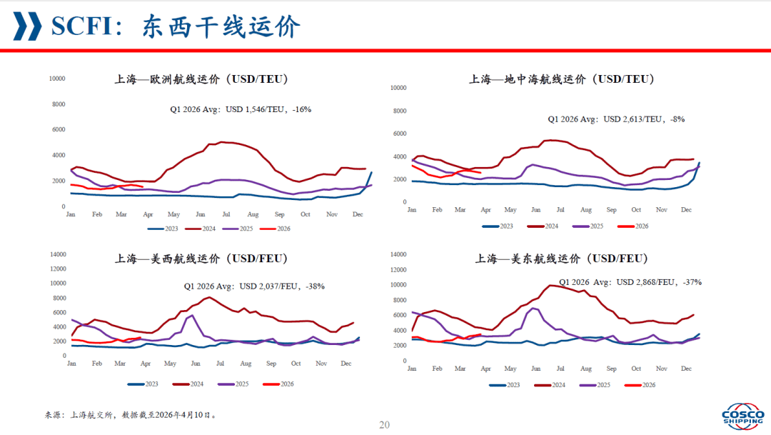 同时,运价表现也呈现明显分化。2026年第一季度,上海至欧洲、美西、美东等东西干线运价同比明显下降,而上海至波湾/红海航线平均运价同比上升69%。这说明地缘政治和区域风险正在直接影响运价结构,市场不再是单一方向的涨跌,而是不同航线、不同区域、不同风险暴露下的分化运行。