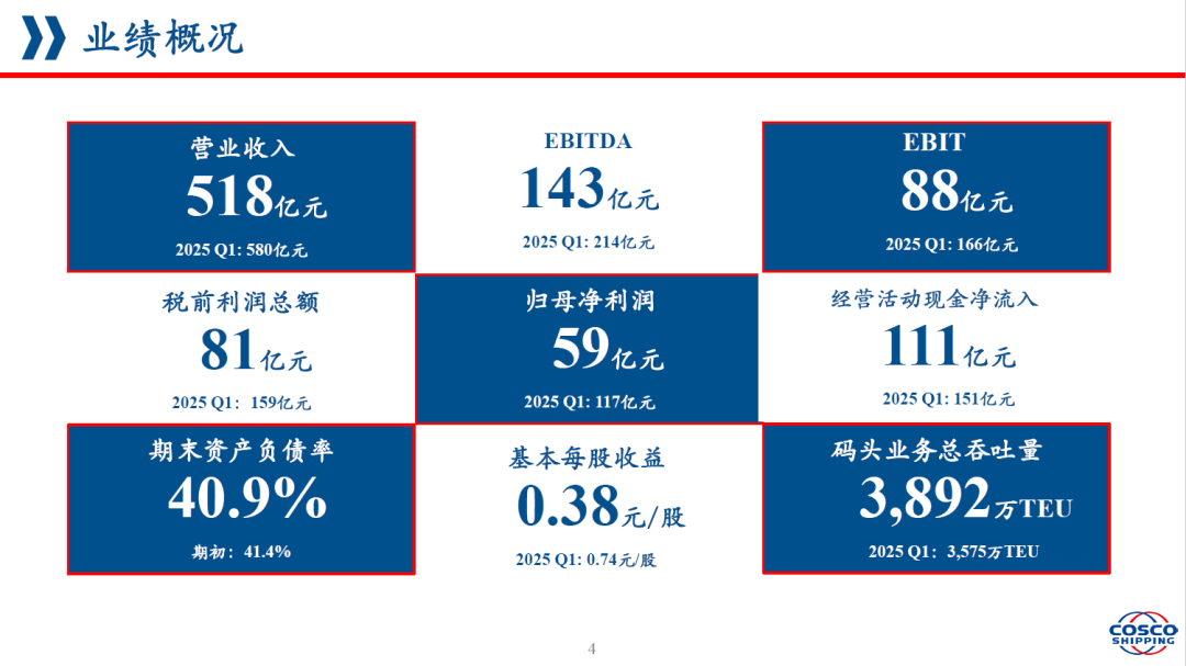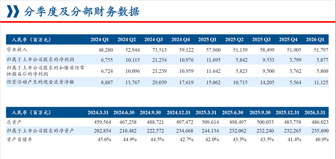 但如果只看同比下降,就会低估这份财报的另一面。公司在一季度实现经营活动现金流量净额人民币111.25亿元,期末现金及现金等价物余额达到人民币1497.02亿元,资产负债率进一步降至40.90%。归属于上市公司股东的所有者权益达到2356.90亿元,较上年末增长1.47%。这说明,在集运市场价格波动和成本压力仍然存在的情况下,中远海控依然维持了较强的现金创造能力和财务安全垫。