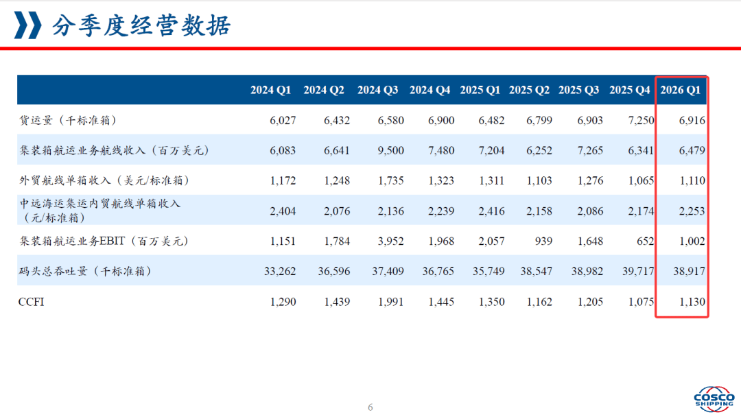 这与当前全球贸易格局变化高度相关。全球供应链正在更强调区域化、多点布局和近岸化,亚洲区域内贸易、中国内贸以及新兴市场之间的联通价值上升。中远海控一季度继续巩固中国市场优势,同时拓展东南亚市场,升级洋浦至海防直航航线,拓展东南亚至美西北、加拿大等服务路径。这些动作并不只是增加几条航线,更是在顺应货流结构变化,提前布局新的增长区间。同时这也体现出中远海控作为央企航运平台,在服务国内国际双循环、保障产业链供应链稳定、支撑中国企业高水平出海方面的主动作为。