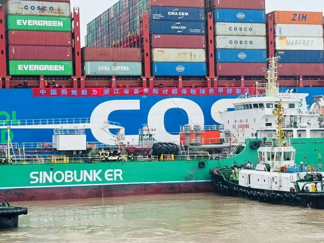 4月22日,中国船燃在宁波梅山岛国际集装箱码头,成功为中远海运集团旗下甲醇双燃料动力集装箱船“中远海运天秤座”轮加注国产绿色甲醇燃料503吨。