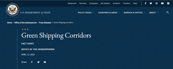 4、4月12日,美国政府发言人办公室发布了一份关于绿色航运走廊的文件,表达了其推进国内外绿色航运走廊建设的决心,以支持到2050年实现温室气体净零排放。文件强调:美国将绿色航运走廊设想为展示低排放和零排放生命周期燃料和技术的海上航线,目标是在走廊的各个方面实现温室气体零排放,以支持不迟于 2050 年的全行业脱碳 。