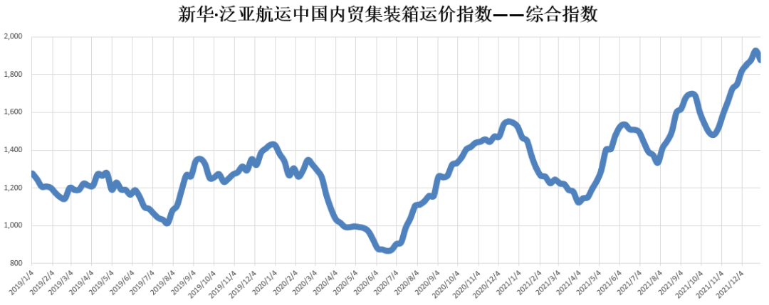 本期报告截至12月31日, 新华·泛亚航运中国内贸集装箱运价指数(XH·PDCI)报1877点,较上期(2021年12月18日至2021年12月24日)环比下跌51点,跌幅2.65%;同比上涨352点,涨幅23.08%;6个区域子指数“一涨五跌”。