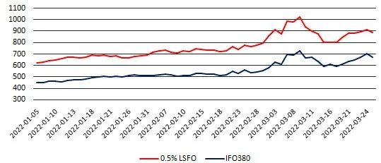 上周新加坡高硫380cst燃料油均价667美元/吨,较前一周均价上涨58美元/吨,0.5%低硫燃料油均价892.8美元/吨,较前一周均价上涨66美元/吨。