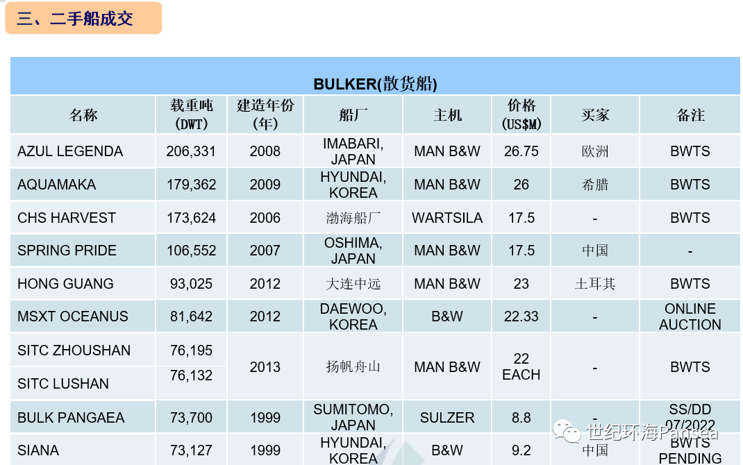 散货二手船市场, 纽卡斯尔型散货船“AZUL LEGENDA”(206,331载重吨,2008年日本今治建造,安装压载水系统)据报以2,675万美元出售给欧洲买家。海岬型散货船“AQUAMAKA”(179,362载重吨,2009年日本今治建造,安装压载水系统)以2,600万美元出售给希腊买家;“CHS HARVEST”(173,624载重吨,2006年渤海船厂建造,安装压载水系统)据报以1,750万美元出售。迷你海岬型散货船“SPRING PRIDE”(106,552载重吨,2007年日本大岛建造)以1,750万美元出售给中国买家。超巴拿马型散货船“HONG GUANG”(93,025载重吨,2012年大连中远建造,安装压载水系统)以2,300万美元出售给土耳其买家。卡姆萨尔型散货船“MSXT OCEANUS”(81,642载重吨,2012年韩国大宇建造)通过网上竞拍方式以2,233万美元出售。巴拿马型散货船“BULK PANGAEA”(73,700载重吨,1999年日本SUMITOMO建造,SS/DD07-2022)以880万美元出售。ULTRAMAX型散货船“TOMINI INTEGRITY”(60,220载重吨,2016年日本ONOMICHI建造,4X30吨克令吊,安装压载水系统)据报以3,300万美元出售给中国买家。超灵便型散货船“LAN HAI SHENG HUI”(56,616载重吨,2011年中海工业江苏建造,4X30吨克令吊,安装压载水系统)通过网上竞拍方式以1.3008亿人民币(约1,700万美元)出售;“BULK ORION”(56,155载重吨,2011年日本三井建造,4X30吨克令吊,安装压载水系统)以2,200万美元出售。灵便型散货船“SN GLORY”(32,259载重吨,2003年日本SAIKI建造,4X30吨克令吊,OHBS)以1,160万美元出售;“CS FELICITY”(28,343载重吨,2009年日本今治建造,4X31吨克令吊,安装压载水系统)以1,450万美元出售。
