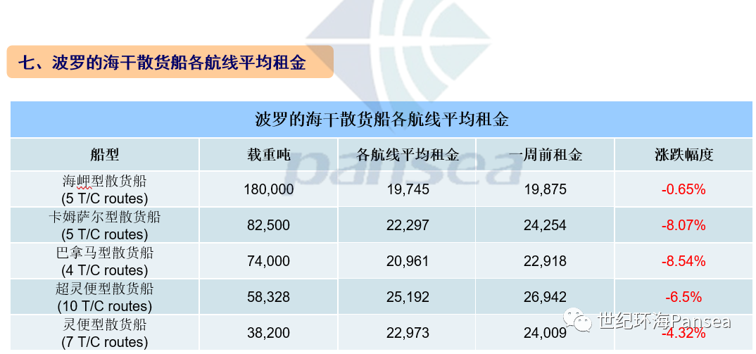海岬型散货船5条航线平均日租金19,745美元,较一周前下降0.65%;卡姆萨尔型散货船5条航线平均日租金22,297美元,较一周前下降8.07%;巴拿马型散货船4条航线平均日租金20,961美元,较一周前下降8.54%;超灵便型散货船10条航线平均日租金25,192美元,较一周前下降6.5%;灵便型散货船7条航线平均日租金22,973美元,较一周前下降4.32%。