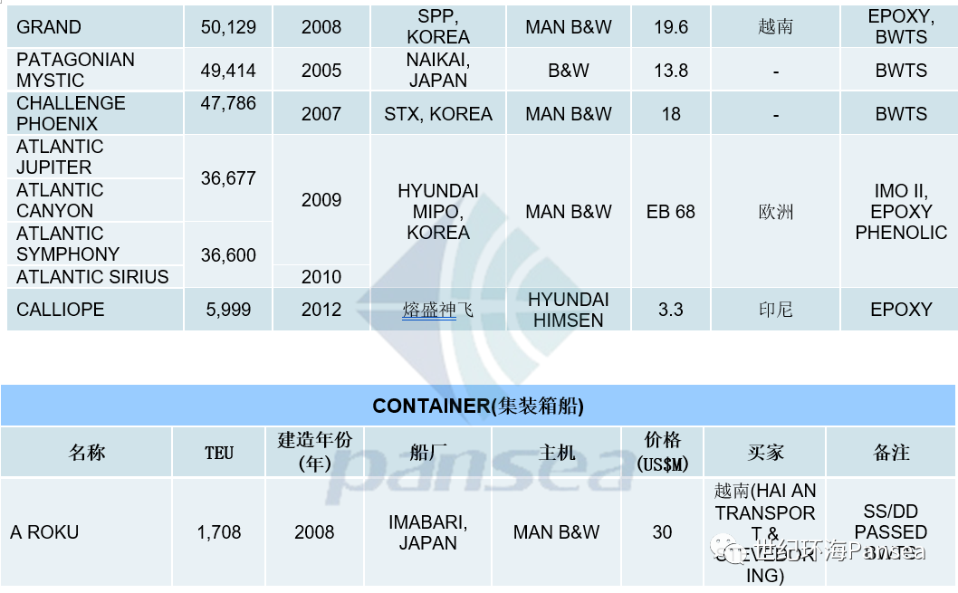 散货二手船市场, 巴拿马型散货船“BONANZA YR”(76,465载重吨,2006年日本常石福山船厂TSUNEISHI FUKUYAMA建造,SS 08-2026/DD 09-2024,安装压载水系统)据报以MID 1,600万美元出售;“KRITON”(73,975载重吨,2003年韩国现代三湖重工建造,SS/DD 11-2023,压载水系统待定)据报以1,500万美元出售。ULTRAMAX型散货船“DAYANG CONFIDENCE”(63,127载重吨,2017年扬州大洋建造,4X35吨克令吊,SS 05-2027,安装压载水系统)据报以3,000万美元出售。超灵便型散货船“SHUN XIN”(56,933载重吨,2010年中远重工建造,4X30吨克令吊,SS 01-2025/DD 03-2023,安装压载水系统)据报以HIGH 1,600万美元出售。灵便型散货船“NORD MONTREAL”(36,570载重吨,2012年日本ONOMICHI建造,4X31吨克令吊,SS/DD 09-2022,ICE CLASS 1C,压载水系统待定)据报以2,200万美元出售;“GLOBAL AQUARIUS”(28,328载重吨,2011年日本今治建造,4X31吨克令吊,SS 01-2025/DD 02-2023,安装压载水系统)据报以1,480万美元出。