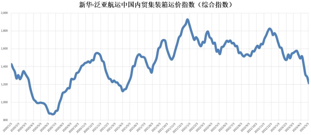 核心提示:本期报告(2023.4.29-5.5)新华·泛亚航运中国内贸集装箱运价指数报1214点,较上期(2023.4.22-4.28)环比下降70点,降幅5.45%;同比下跌327点,降幅1.22%;6只区域子指数一涨五跌,4只流向指数一涨三跌。