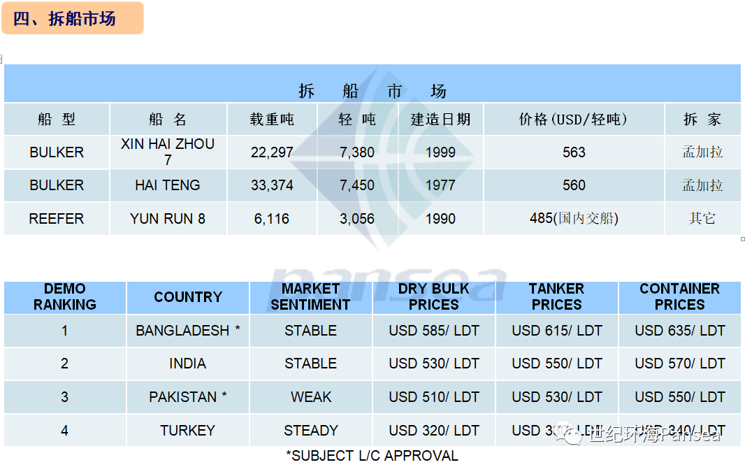 拆船市场,在供应吨位持续放缓的情况下,以及传统上较为平静的夏季季风月份的到来,有利于整个次大陆市场价格保持稳定。6月1日孟加拉国的预算即将出台,众多终端买家静待新的预算是否对船舶回收部门产生新的税收变化。就目前看来,普遍的共识是即将到来的预算预计不会造成负面影响,实际上反而对孟加拉国的整体商业前景有利。与此同时, 印度市场在最近的价格波动之后逐渐稳定下来,当下有了新兴的需求。而巴基斯坦仍然处于观望状态,政治和经济的混乱使得这个市场在短期内难以参与竞争。孟加拉国市场,基本面继续波动,孟加拉国塔卡兑美元的汇率仍然处于BDT 107.1,当地钢板价格在本周再次持平。在孟加拉国的监管机构已承诺批准香港绿色拆船公约后,本周,日本船东协会和四家日本主要航运公司的代表前往该国,参观了当地多个拆船厂,并与孟加拉国拆船和回收商协会的成员重点就增加符合香港公约标准的船厂数量进行了建设性的对话。这对后期孟加拉国参与绿色拆船的竞标是重大利好。印度市场,由于近期的许多拆解船只都来自远东,考虑到开往孟加拉国的运输成本较低,致使印度错失了一些绿色回收船只的交易。此外,当地的基本面亦不稳定,钢铁价格又经历了动荡的一周,下跌了约5美元/吨,而印度卢比兑美元的汇率最终回落到RS. 82.5。印度市场的需求依旧旺盛,并试图重新夺回绿色拆船的市场份额。巴基斯坦市场仍然处于次大陆回收市场的边缘,在升级设施以符合香港绿色拆船公约标准方面亦未取得进展。从长远来看,政治和经济混乱将继续困扰着这个国家,同时当地银行和信用证的签发极大程度地影响着巴基斯坦重回市场谈判的机率。