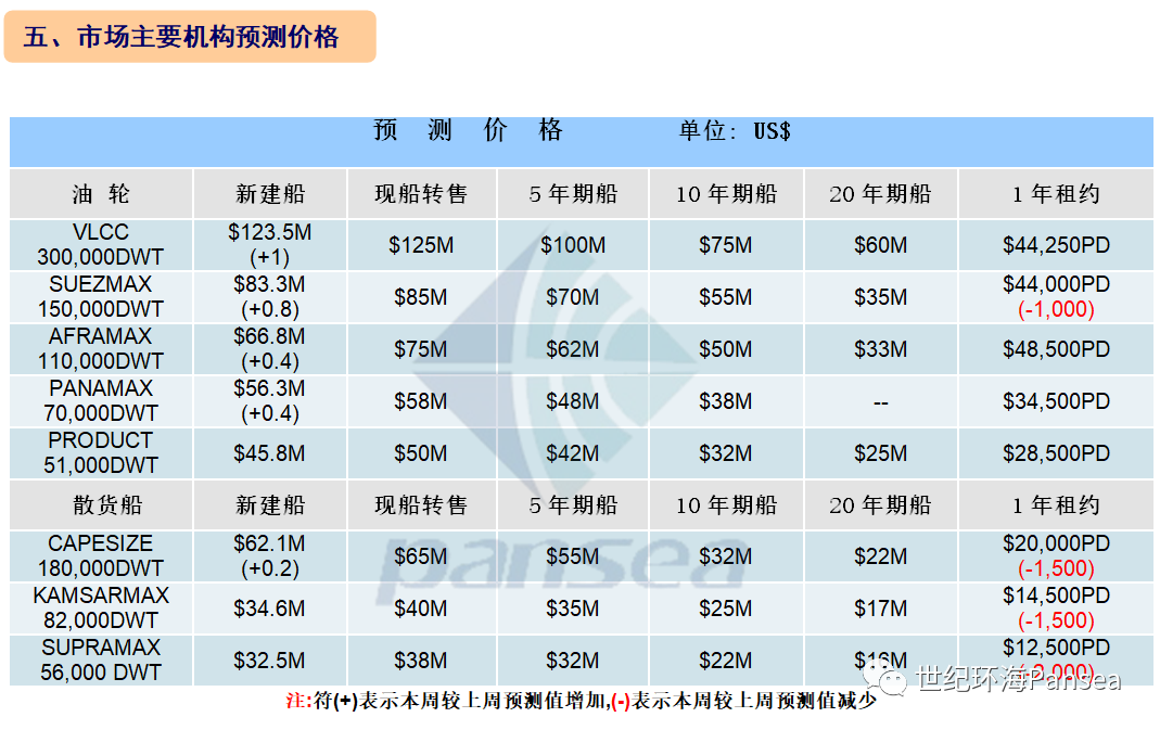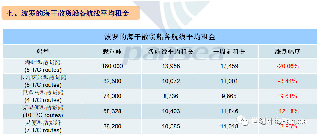 海岬型散货船5条航线平均日租金13,956美元,较一周前下降20.06%;卡姆萨尔型散货船5条航线平均日租金10,072美元,较一周前下降8.44%;巴拿马型散货船4条航线平均日租金8,736美元,较一周前下降9.61%;超灵便型散货船10条航线平均日租金10,403美元,较一周前下降12.18%;灵便型散货船7条航线平均日租金10,585美元,较一周前下降3.93%。