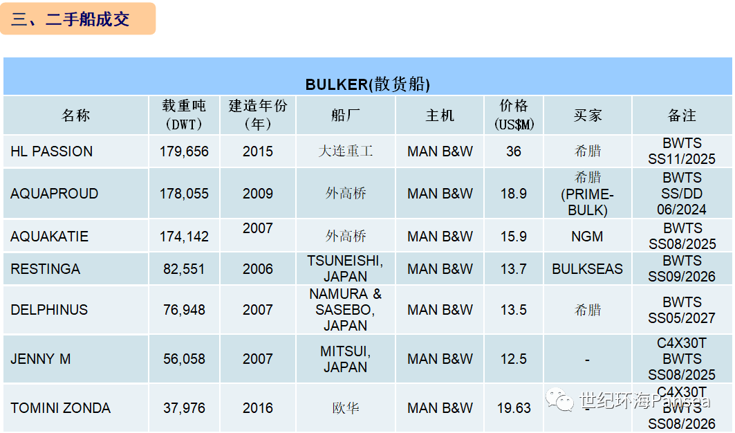 散货二手船市场,海岬型散货船“HL PASSION”(179,656载重吨,2015年大连重工建造,SS 11-2025/DD 12-2023,安装压载水系统)据报以3,600万美元出售给希腊买家;“AQUAPROUD”(178,055载重吨,2009年外高桥建造,SS/DD 06-2024,安装压载水系统)据报以1,890万美元出售给PRIMEBULK;“AQUAKATIE”(174,142载重吨,2007年外高桥建造,SS 08-2025/DD 02-2025,安装压载水系统)据报以 1,590万美元出售给NGM。卡姆萨尔型散货船“RESTINGA”(82,551载重吨,2006年日本常石建造,SS 09-2026/DD 02-2025,安装压载水系统)据报以1,370万美元出售给BULKSEAS。巴拿马型散货船“DELPHINUS”(76,948载重吨,2007年日本名村和佐世保建造,SS 05-2027,安装压载水系统)据报以1,350万美元出售给希腊买家。灵便型散货船“TOMINI ZONDA”(37,976载重吨,2016年浙江欧华建造,4X30吨克令吊,SS 08-2026/DD 08-2024,安装压载水系统)据报以1,963万美元出售;“GLORIUOS MAHUTA”(37,775载重吨,2015年日本今治建造,4X31吨克令吊,SS 06-2025/DD 07-2023,安装压载水系统)据报以2,050万美元出售;“BEN RINNES”(35,000载重吨,2015年江东船厂建造,4X30吨克令吊,SS 09-2025/DD 10-2023,安装压载水系统)据报基于2年期租给嘉吉的条件,以1,650万美元出售给希腊买家。