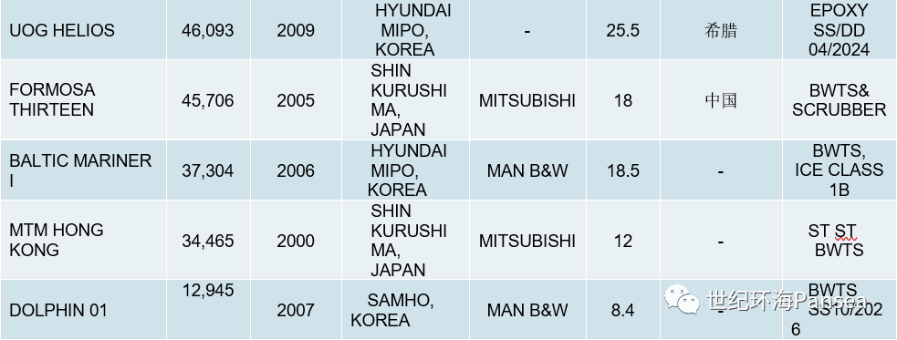 油轮二手船市场,LR型姊妹油轮“AESOP”(74,588载重吨,2012年韩国现代尾浦建造,SS 01-2027/DD 12-2024,12环氧涂层舱,安装压载水系统)和“SIENA”(74,565载重吨,2012年韩国现代尾浦建造,SS 03-2027/DD 10-2024,12环氧涂层舱,安装压载水系统)据报以每艘4,150万美元出售给希腊NAFTOMAR。MR型油轮“ELAFONISOS BAY”(50,698载重吨,2009年韩国SPP建造,SS/DD 03-2024,12环氧涂层舱,CAP 1,安装压载水系统)据报以2,500万美元出售;“UOG HELIOS”(46,093载重吨,2009年韩国现代尾浦建造,SS/DD 04-2024,12环氧涂层舱)据报以2,550万美元出售给希腊买家;“FORMOSA THIRTEEN”(45,706载重吨,2005年日本SHIN KURUSHIMA建造,SS/DD 03-2025,16镀锌涂层舱, CAP 1,安装压载水系统和废气洗涤器)据报以1,800万美元出售给中国买家;“BALTIC MARINER I”(37,304载重吨,2006年韩国现代尾浦建造,SS 10-2026/DD 12-2024,12环氧涂层舱, ICE CLASS 1B ,CAP 1,安装压载水系统)据报以1,850万美元出售。油化船“DOLPHIN 01”(12,945载重吨,2007年韩国三湖重工建造,SS 10-2026,安装压载水系统)据报以840万出售。