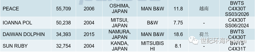 散货二手船市场,海岬型散货船“FRONTIER BRILLIANCE”(181,412载重吨,2013年日本今治建造,SS/DD 12-2023,安装压载水系统)据报以约3,000万美元出售给ALBERTA SHIPMANAGEMENT;“CYMONA IRON”(176,505载重吨,2011年外高桥建造,SS 01-2026/DD 08-2025,安装压载水系统和废气洗涤器)据报以2,600万美元出售。卡姆萨尔型散货船“STL MIRACLE”(82,338载重吨,2008年日本大岛建造,坞、特检刚通过,安装压载水系统)据报以LOW 1,500万美元出售给希腊买家。巴拿马型散货船“MAGIC PHOENIX”(76,636载重吨,2008年日本今治建造,SS/DD 11-2023,安装压载水系统)据报以约1,400万美元出售;“LADY MARITE”(76,529载重吨,2009年日本SHIN KASADO建造,SS/DD 11-2024,安装压载水系统)据报以1,575万美元出售给欧洲买家;“MAGIC SUN”(75,311载重吨,2001年韩国三湖重工建造,SS 08-2025/DD 12-2023,安装压载水系统)据报以670万美元出售。ULTRAMAX 型散货船“SANTA FRANCESCA”(61,250载重吨,2016年日本SHIN KASADO建造,4X31吨克令吊,SS 01-2026/DD 01-2024,安装压载水系统)据报以2,680万美元出售给希腊买家。超灵便型散货船“IOANNA POL”(50,238载重吨,2004年日本三井建造,4X30吨克令吊,SS/DD 06-2024,压载水系统待定)据报以775万美元出售。灵便型散货船“DAIWAN DOLPHIN”(34,393载重吨,2015年日本名村建造,4X30吨克令吊,SS/DD 03-2025,安装压载水系统)据报以1,860万美元出售。
