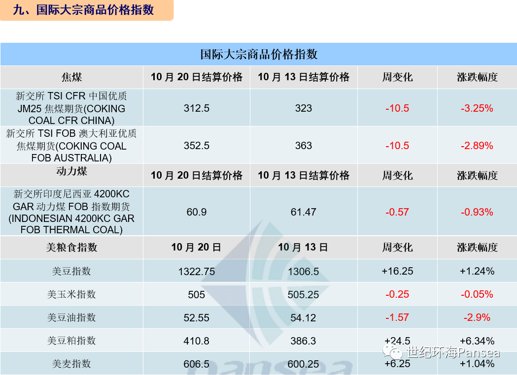 海岬型散货船5条航线平均日租金29,493美元,较一周前上涨6.89%;卡姆萨尔型散货船5条航线平均日租金14,738美元,较一周前上涨4.5%;巴拿马型散货船4条航线平均日租金13,402美元,较一周前上涨4.97%;超灵便型散货船10条航线平均日租金14,153美元,较一周前上涨1.46%;灵便型散货船7条航线平均日租金12,352美元,较一周前下跌0.07%。