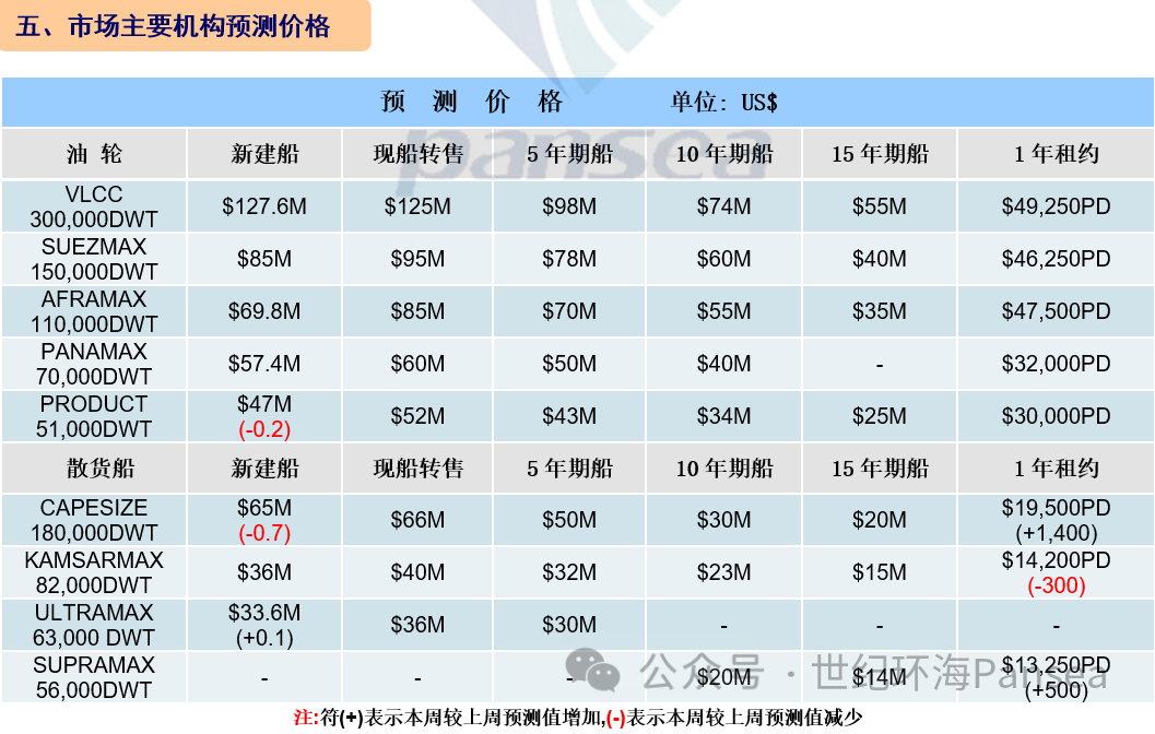 新造船市场,中远海运集团旗下两家航运公司和旗下两家船厂签署8艘甲醇双燃料船大单,打造船队绿色低碳化、智能化转型。其中中远海运散运与扬州中远海运重工签署了2艘325,000载重吨甲醇双燃料动力超大型矿砂船(VLOC)建造合同,预计2026年第四季度-2027年第二季度间交付;中远海运能源通过全资子公司海南中远海运能源运输有限公司与扬州中远海运重工签订了3艘114,200载重吨阿芙拉型绿色甲醇双燃料原油运输船建造合同,总价17.37亿人民币,相当于单船价格5.79亿人民币,预计将于2026-2027年交付;与此同时,中远海运能源还在大连中远海运重工签订了3艘油轮建造合同。其中,中远海运能源作为买方订造的1艘49,900载重吨MR型油轮,造价 3.49亿人民币,新船预计于2026年11月30日交付,以及海南中远海运能源订造的2艘64,900载重吨巴拿马型原油船,每艘造价4.15亿人民币,预计将于2026年交付。此外,福建国航远洋运输(集团)股份有限公司与芜湖造船厂签署建造4+6艘89,000载重吨甲醇双燃料散货船合同,每艘造价3,648万美元,预计2025-2026年交付。外高桥接获希腊船东CAPE SHIPPING建造115,000载重吨阿芙拉型油轮订单,将于2025年交付。希腊MINERVA MARINE在新时代造船订造了2艘114,000载重吨LNG双燃料LR2阿芙拉型成品油轮,预计2027年第一季度和第二季度交付。这家拥有70多艘船舶的多元化船东于去年12月与新时代造船签署了意向书。国外船厂方面,希腊船东SAFE BULKERS在日本船厂订造1艘82,000载重吨散货船,预计将在2026年交付。希腊船东CARDIFF GROUP在韩国三星订造2艘93,000立方米氨运输船,每艘造价1.2亿美元,将于2027年交付。另外,挪威天然气船东SOLVANG与韩国现代重工签订建造2艘88,000立方米VLGC新造船的合同,总价值约2.3亿美元,这笔订单也将使SOLVANG在蔚山船厂的系列新造船数量达到7艘。
