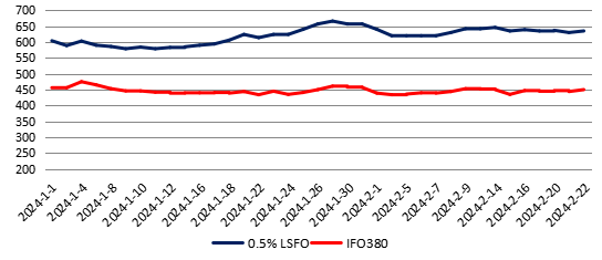 上周新加坡高硫380cst燃料油均价445.8美元/吨,较前一周均价下跌0.2美元/吨,0.5%低硫燃料油均价632.8美元/吨,较前一周均价下跌7.7美元/吨。