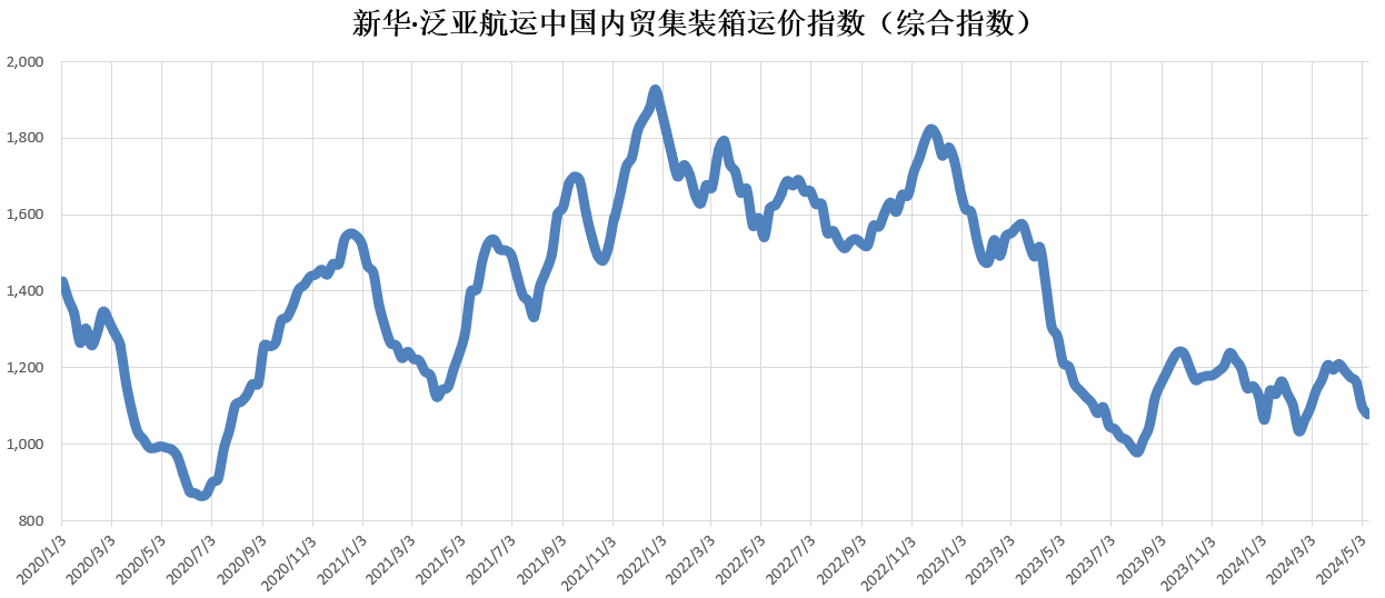 核心提示:本期(5月4日至10日),新华·泛亚航运中国内贸集装箱运价指数(XH·PDCI)报1079点,较上期(2024年4月27日至5月3日)下跌21点,跌幅1.91%,同比下跌125点,跌幅10.38%;6只区域子指数“两涨四跌”,4只流向子指数“两涨两跌”。