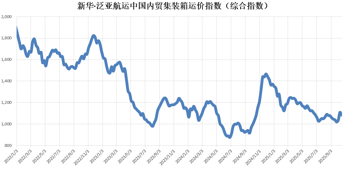 核心提示:本期(10月11日至10月17日)新华·泛亚航运中国内贸集装箱运价指数(XH·PDCI)报1084点,较上期(10月4日至10月10日)下跌25点,跌幅2.25%;同比上涨3点,涨幅0.28%;6只区域子指数三涨三跌,4只流向指数两涨两跌。