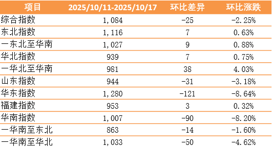 此外,山东指数报944点,环比下跌31点,跌幅3.18%;华东指数报1280点,环比下跌121点,跌幅8.64%;福建指数报953点,环比上涨3点,涨幅0.32%。