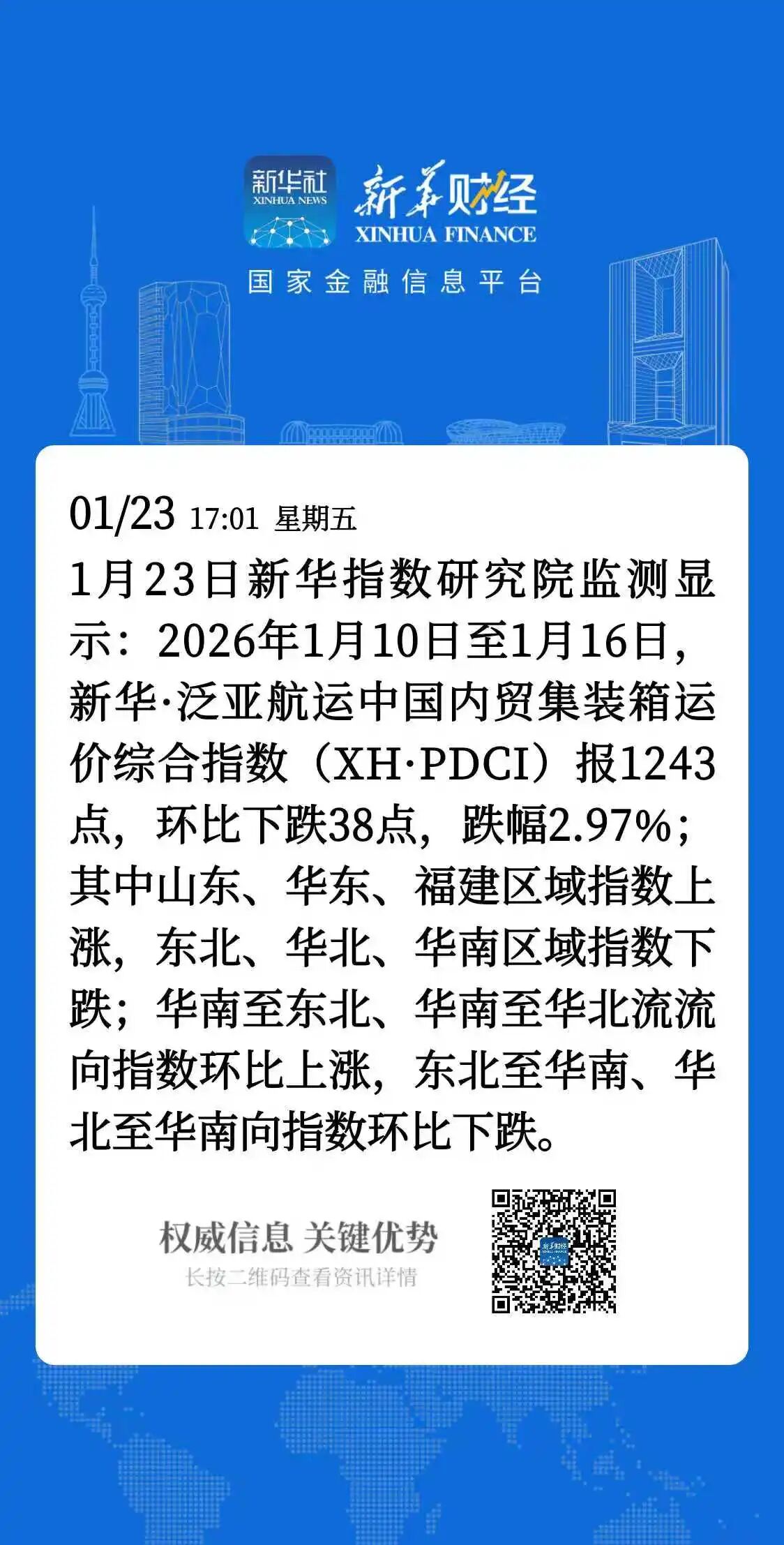 核心提示:本期(2026年1月10日至1月16日)新华·泛亚航运中国内贸集装箱运价指数(XH·PDCI)报1243点,较上期(2026年1月3至2026年1月9日)下跌38点,跌幅2.97%;同比下跌17点,跌幅1.35%;6只区域子指数三涨三跌,4只流向指数两涨两跌。