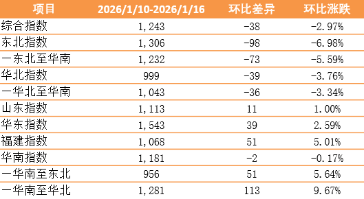 此外,山东指数报1113点,环比上涨11点,涨幅1.00%;华东指数报1543点,环比上涨39点,涨幅2.59%;福建指数报1068点,环比上涨51点,涨幅5.01%。