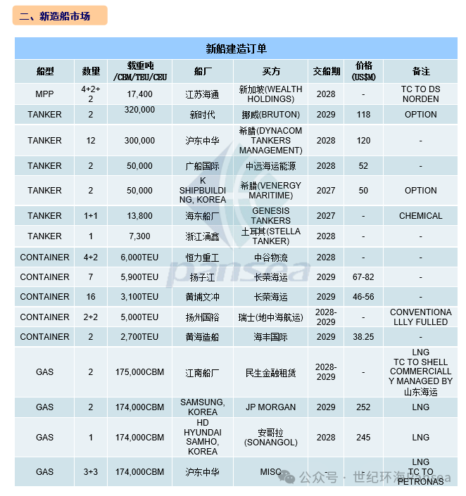 新造船市场,总部位于新加坡的WEALTH HOLDINGS进军多用途船舶领域,在江苏海通下单4+2+2艘17,400载重吨多用途新造船,这批新造船锁定同丹麦运营商 DS NORDEN的租约。希腊船东DYNACOM TANKERS MANAGEMENT在沪东中华下单至多12艘300,000载重吨VLCC新造船,单船造价超1.2亿美元,预计将于2028年交付。中远海运能源在广船国际下单2艘50,000载重吨MR型油轮新造船,单船造价5,200万美元,预计将于2028年交付。希腊VENERGY MARITIME宣布执行在韩国K SHIPBUILDING多建造2艘50,000载重吨MR型油轮的选择权,单船造价在5,000万美元,将于2027年交付。中谷物流在恒力重工下单4+2艘6,000TEU集装箱新造船,预计将于2028年开始相继交付。长荣海运通过其子公司EVERGREEN MARINE ASIA在中船黄埔文冲下单16艘约3,100TEU支线集装箱船,同时在扬子江船业下单7艘5,900TEU超巴拿马型集装箱新造船,新船预计将于2029年交付。地中海航运在扬州国裕下单2+2艘5,000TEU传统燃料集装箱新造船,预计将于2028年下半年至2029年年初交付。海丰国际在黄海造船下单2艘2,700TEU集装箱新造船,单船造价在3,825万美元,预计将于2029年1-3月交付。民生金融租赁在江南船厂下单2艘175,000立方米液化天然气运输新造船,新船预计将于2028年至2029年交付。这批船待交付后将由位于英国的能源巨头壳牌租用,民生金融租赁公司作为船东,山东海运将负责商业管理,而壳牌国际航运将负责技术运营。安哥拉SONANGOL在韩国现代三湖船厂下单1艘174,000立方米液化天然气运输新造船,该船造价在2.45亿美元,将于2028年交付。