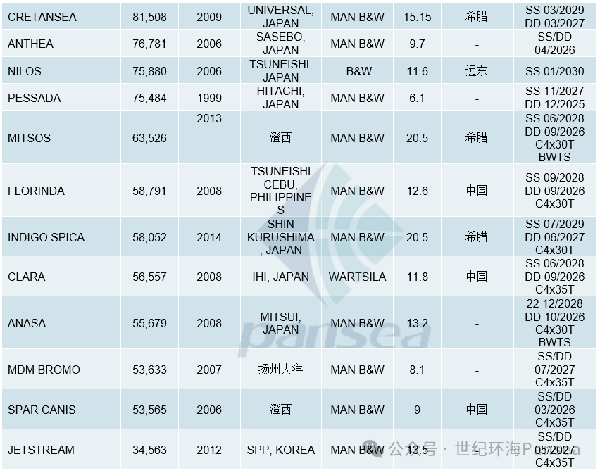 散货二手船市场,纽卡斯尔型散货船“MAX WARRIOR”(205,361载重吨,2014年启东船厂建造,SS 07-2029/DD 11-2027)据报以4,300万美元出售。海岬型散货姊妹船“ALLY”(185,897载重吨,2005年日本川崎建造,SS 04-2030/DD 07-2028)和“MIKATA”(177,173载重吨,2005年日本名村建造,SS 06-2030/DD 07-2028)据报以3,700万美元打包出售,已交付;“ROBUSTO”(173,949载重吨,2006年上海外高桥建造,SS/DD 09-2026,安装废气洗涤器)据报以1,950万美元出售。超巴拿马型散货船“YANGZE 903”(93,242载重吨,2012年江苏新扬子建造,SS/DD 04-2027,安装压载水系统)据报以1,270万美元出售。卡姆萨尔型散货船“JP CARETTA”(88,083载重吨,2008年日本今治建造,SS 12-2028,安装废气洗涤器)据报以1,360万美元出售给中国买家;“AYA”(82,992载重吨,2006年日本常石建造,SS 06-2026)据报以1,080万美元出售给中国买家。巴拿马型散货船“ANTHEA”(76,781载重吨,2006年日本佐世保建造,SS/DD 04-2026)据报以970万美元出售;“NILOS”(75,880载重吨,2006年日本常石建造,SS 01-2030)据报以1,160万美元出售给远东买家。ULTRAMAX型散货船“MITSOS”(63,526载重吨,2013年澄西船厂建造,SS 06-2028/DD 09-2026,4x30吨克令吊)据报以2,050万美元出售给希腊买家。超灵便型散货船“FLORINDA”(58,791载重吨,2008年菲律宾常石建造,SS 09-2028,4x30吨克令吊)据报1,260万美元出售给中国买家;“INDIGO SPICA”(58,052载重吨,2014年日本SHIN KURUSHIMA建造,4x30吨克令吊,SS 07-2029/DD 06-2027)据报以2,050万美元出售给希腊买家;“MDM BROMO”(53,633载重吨,2007年扬州大洋建造,4x35吨克令吊,SS/DD 07-2027)据报以810万美元出售。灵便型散货船“JETSTREAM”(34,563载重吨,2012年韩国SPP建造,4x35吨克令吊,SS/DD 05-2027)据报以约1,350万美元出售。