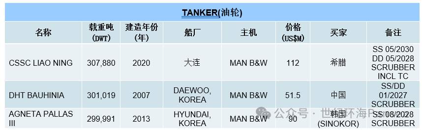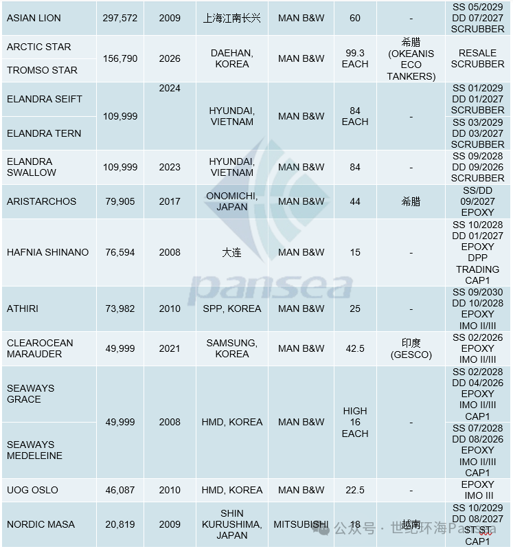 油轮二手船市场,超大型油轮“CSSC LIAO NING”(307,880载重吨,2020年大连船厂建造,SS 05-2030/DD 05-2028,安装废气洗涤器)据报以1.12亿美元出售给希腊买家,附带到2026年5月的租约,日租金为41,275美元;DHT HOLDINGS将旗下最老的超大型油轮“DHT BAUHINIA”(301,019载重吨,2007年韩国大宇建造,SS/DD 01-2027,安装废气洗涤器)以5,150万美元出售给中国买家;“AGNETA PALLAS III”(299,991载重吨,2013年现代重工建造,SS 08-2028,安装废气洗涤器)据报以9,000万美元出售给SINOKOR;“ASIAN LION”(297,572载重吨,2009年上海江南长兴船厂建造,SS 05-2029/DD 07-2027,安装废气洗涤器)据报以6,000万美元出售。苏伊士型油轮姊妹船“ARCTIC STAR”和“TROMSO STAR”(156,790载重吨,2026年大韩造船建造,安装废气洗涤器)据报以每艘9,930万美元打包出售给希腊OKEANIS ECO TANKERS。2艘2024年现代越南船厂建造、安装废气洗涤器的阿芙拉型油轮姊妹船“ELANDRA SWIFT”和“ELANDRA TERN”据报以每艘8,400万美元打包出售;船龄老一年的姊妹船“ELANDRA SWALLOW”据报也以8,400万美元出售。LR型油轮“ARISTARCHOS”(79,905载重吨,2017年日本ONOMICHI建造,SS/DD 09-2027,14环氧涂层舱,宽梁,86,000立方米)据报以4,400万美元出售给希腊买家;“HAFNIA SHINANO”(76,594载重吨,2008年大连重工建造,SS 10-2028/DD 01-2027,14环氧涂层舱,DPP-TRADING,CAP1)据报以1,500万美元出售。MR型油轮“CLEAROCEAN MARAUDER”(49,999载重吨,2021年三星重工建造,SS 02-2026)据报以4,250万美元出售给印度GESCO;姊妹船“SEAWAYS GRACE”(49,999载重吨,2008年现代尾浦建造,SS 02-2028/DD 04-2026,12环氧涂层舱,IMO II/III,CAP1)和“SEAWAYS MEDELEINE”(49,999载重吨,2008年现代尾浦建造,SS 07-2028/DD 08-2026,12环氧涂层舱,IMO II/III,CAP1)据报每艘以1,680万美元打包出售。不锈钢油轮“NORDIC MASA”(20,819载重吨,2009年日本SHIN KURUSHIMA建造,SS 10-2029/DD 08-2027,22不锈钢舱,CAP1)据报以1,800万美元出售给越南买家。