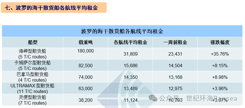 海岬型散货船5条航线平均日租金31,809美元,较一周前上涨35.76%;卡姆萨尔型散货船5条航线平均日租金15,686,较一周前上涨8.15%;巴拿马型散货船4条航线平均日租金14,350美元,较一周前上涨8.98%;ULTRAMAX型散货船11条航线平均日租金13,489美元,较一周前上涨3.96%;灵便型散货船7条航线平均日租金11,124美元,较一周前上涨3.07%。