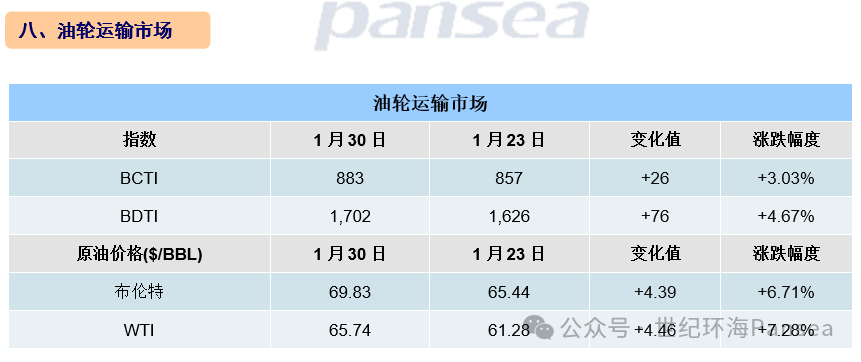 本周干散货运输市场,所有船型运价指数继续回升。其中,海岬型船运价指数大幅上涨924点,巴拿马型船运价指数上涨131点,超灵便型船运价指数提升41点,灵便型船运价指数微升18点,最终波罗的海干散货综合运价指数(BDI)收于2,148点,涨幅为21.91%。