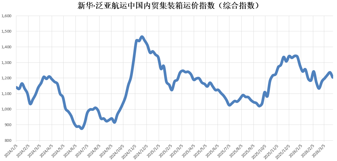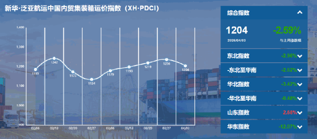 核心提示:本期(2026年3月28日至4月3日)新华·泛亚航运中国内贸集装箱运价指数(XH·PDCI)报1204点,较上期(2026年3月21日至2026年3月27日)下跌32点,跌幅2.59%;同比下跌21点,跌幅1.71%;6只区域子指数一涨四跌一持平,4只流向指数一涨三跌。