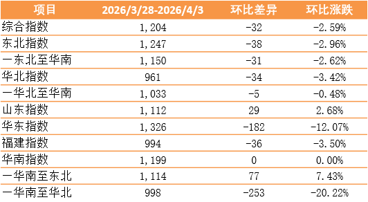 此外,山东指数报1112点,环比上涨29点,涨幅2.68%;华东指数报1326点,环比下跌182点,跌幅12.07%;福建指数报994点,环比下跌36点,跌幅3.50%。