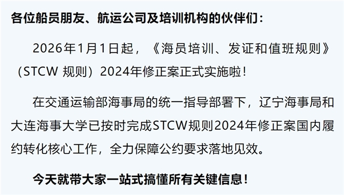 各位船员朋友、航运公司及培训机构的伙伴们: 2026年1月1日起,《海员培训、发证和值班规则》(STCW 规则)2024年修正案正式实施啦! 在交通运输部海事局的统一指导部署下,辽宁海[详细]