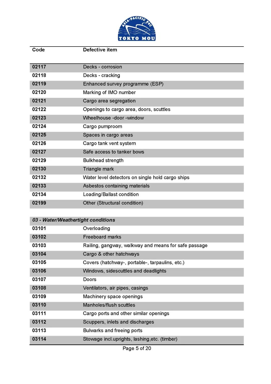 ●本月初,亚太地区港口国监督谅解备忘录(T-MOU)发布了最新的PSC缺陷代码表,下载地址附后。PSC检查中,PSCO记录发现的缺陷时,将使用相应的缺陷代码。建议航运公司和船舶分析研究该表,对应其中的缺陷代码,做好证书文书、设备、演习、操作等项目的自查自纠、维护保养等工作,避免检查时被开具缺陷。