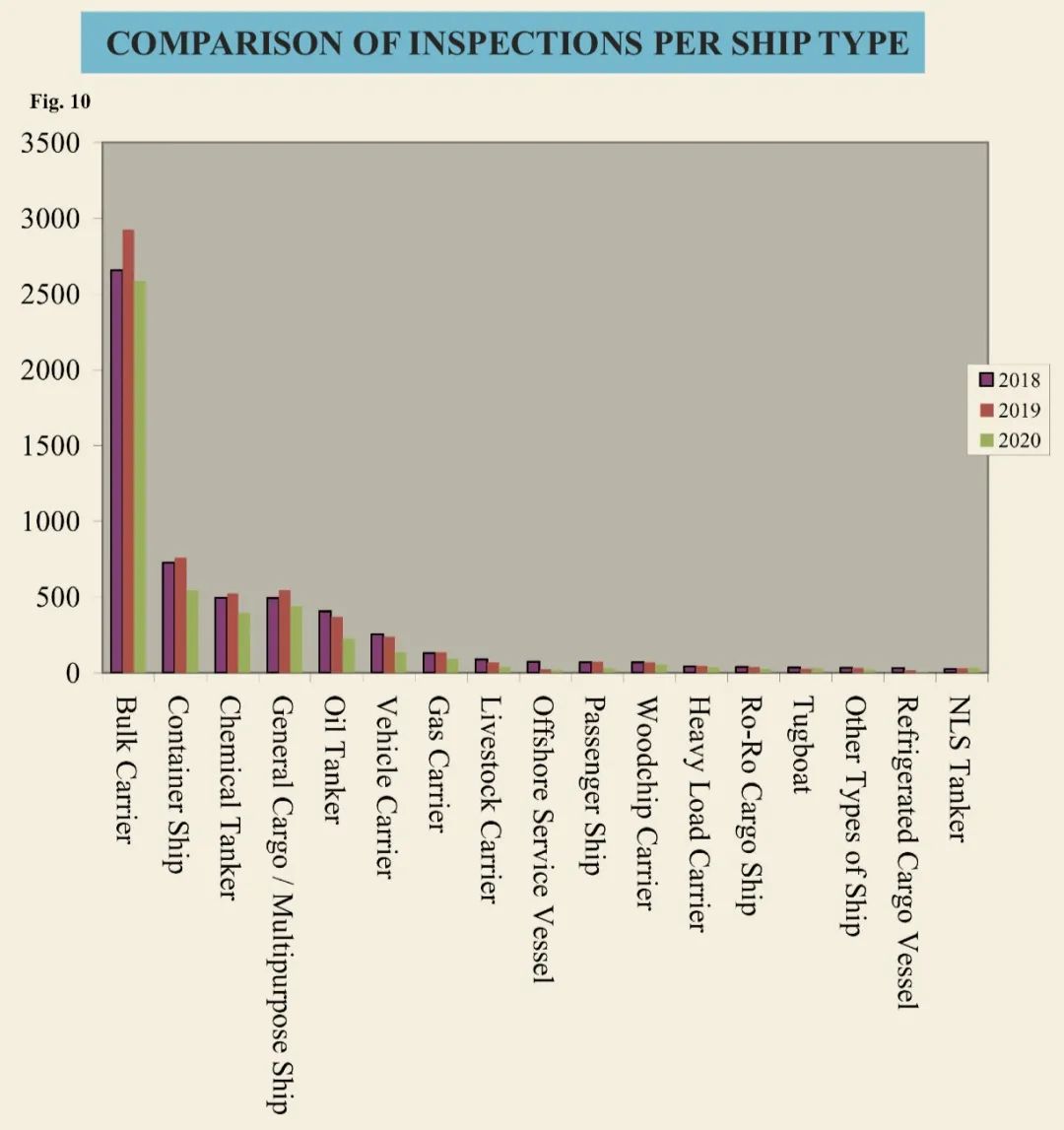 54%的受检船舶是散货船,总计2587艘次,其次为集装箱船(11%,545艘次),第三是杂货船/多用途船(9%,441艘次)。与2019年相比,这三类船舶接受检查的数量都有所减少。