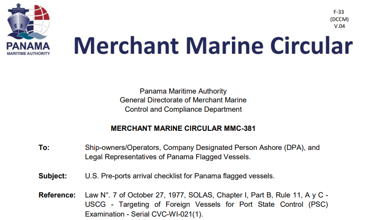 巴拿马船旗国于2021年5月发布商船通函MMC-381,目的是对抵达美国港口的船舶实施额外评估要求,以减少在美国港口停靠的可能要接受港口国管制(PSC)检查的船只的滞留数量。