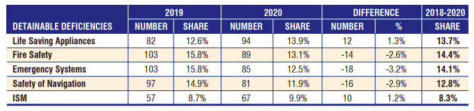 2020年检查时发现的大多数可滞留缺陷与救生设备(13.9%)、消防安全(13.1%)、应急系统(12.5%)、航行安全(11.9%)和ISM(9.9%)有关。这五个类别占2020年发现的可滞留缺陷总数的61.3%。